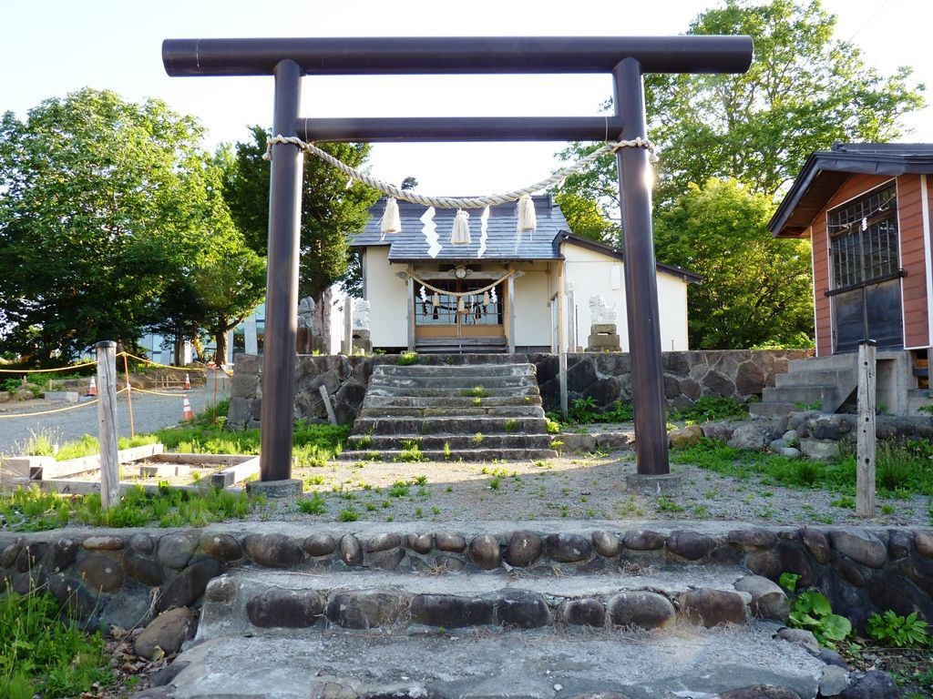 神社は現在解体工事中の旧古平町役場庁舎の隣りにあり、奥には新庁舎が見えますね。