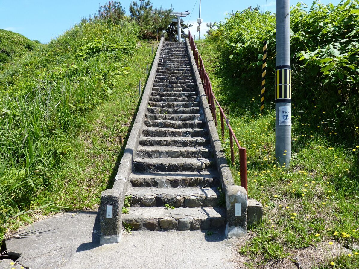 海岸線に連なる集落の中間ほどに、海岸段丘を登っていく階段と赤い両部鳥居が特徴的な神社が見えます。木も生えていない段丘なのに、下からはなぜか社殿が見えず不思議に思いましたがのちに判明しました。