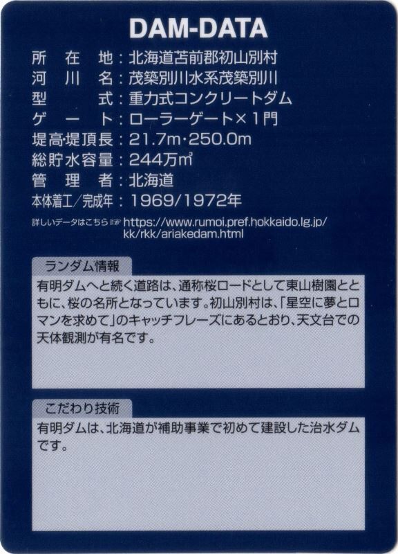 有明ダムは苫前郡初山別村字有明にあり、二級河川茂築別川上流に建設された重力式コンクリートダムです。