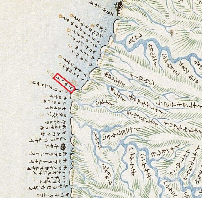 エンルオマモイ(エンルモマモイ)<enrum-oma-moy>〈岬・にある(入り込んでいる)・入江〉 本名エンルムオマムイという。〈旧市街は段丘下の浜にあり、そのとおりの所。〉松浦武四郎〈山田秀三補足説明〉